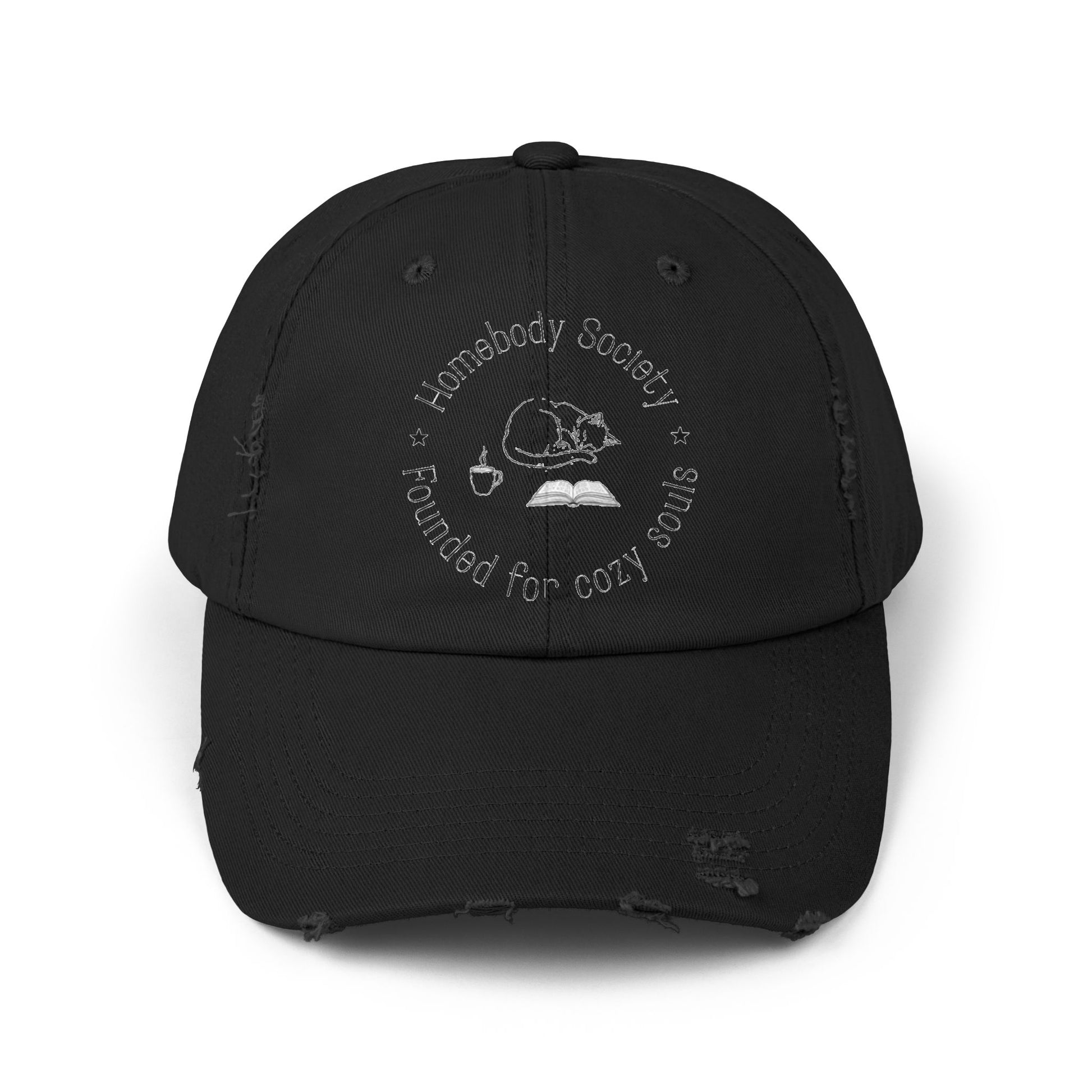 Wrap yourself in comfort wherever you go with the Homebody Society cap — a tribute to cozy souls who find joy in quiet moments. Featuring a minimalist printed design of a resting cat, a steaming cup, and an open book, this cap perfectly captures the spirit of calm simplicity. Its gently distressed finish adds a touch of vintage personality, making it as stylish as it is relaxed. Ideal for slow mornings, bookstore strolls, or lounging on a weekend getaway, this hat brings a sense of warmth and belonging to every outfit.