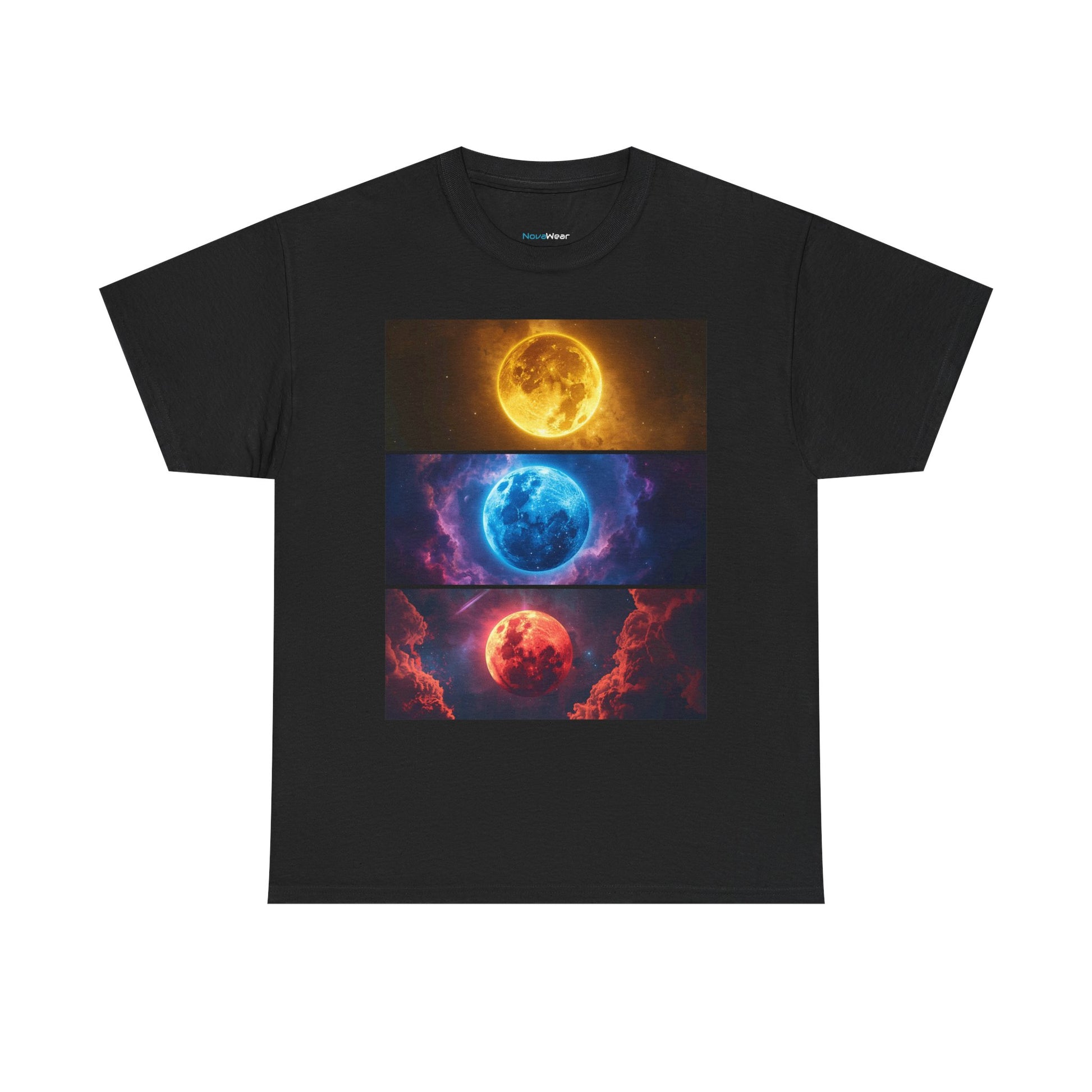 Celebrate the mystique of the night sky with this celestial-inspired tee, featuring a vivid display of three moons — golden, blue, and crimson — symbolizing energy, balance, and transformation. The artwork captures the beauty of cosmic cycles, perfect for stargazers, dreamers, and anyone drawn to the mysteries of the universe. Soft, durable, and effortlessly stylish, this shirt pairs perfectly with casual looks or layered outfits, making it a versatile addition to any wardrobe.